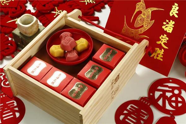 良渚博物院推出的“良渚定胜”礼盒,其中高足盘的器型设计元素来自于良渚文化的黑陶豆,其釉色采用良渚嵌玉漆杯红色,以刻符“鸟纹”金花纸来装饰,彰显良渚元素。礼盒内的定胜糕有蛋黄肉松和豆沙两种口味。