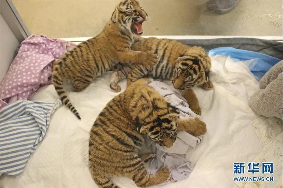 2017年2月7日拍摄的新生马来亚虎幼崽。这三只马来亚虎生于2017年2月3日。图片来源:新华社/美联