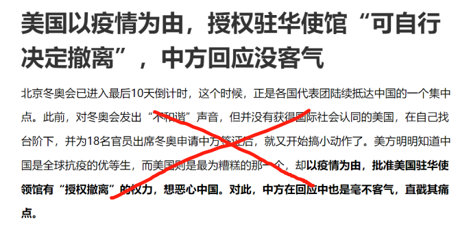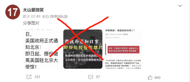 该消息随后被传播至推特平台,产生了变形。有推特用户声称,美国大使馆将从中国撤离,这意味着中美“与断交还差半步”“世界各国都会重新站队,重新洗牌”,暗示中美关系已经破裂。