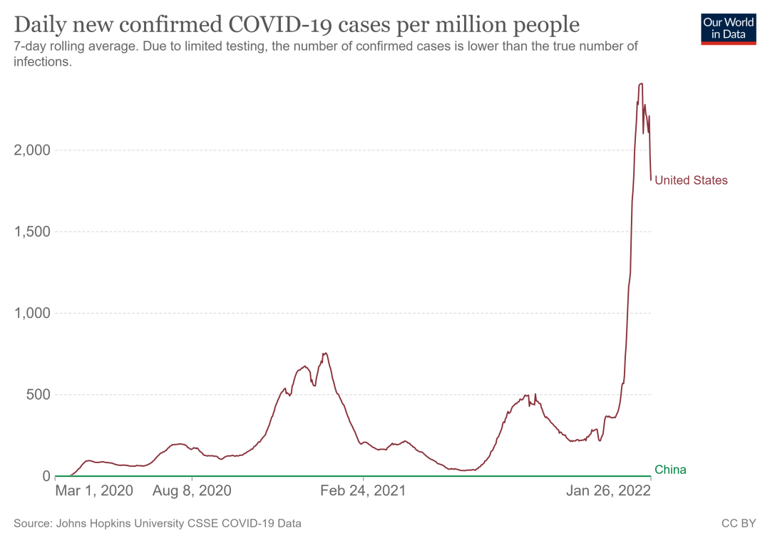 据中国国家卫健委数据,截至2022年1月26日,中国大陆31个省(自治区、直辖市)和新疆生产建设兵团的现有新冠确诊病例共2361例(其中重症7例),累计确诊病例为105811例,累计死亡病例4636例。相较而言,美国疾病控制和预防中心(CDC)数据显示,同一时间段美国全域的新冠累计确诊数已突破7000万,约为中国的700倍,累计死亡人数已超过89万,而美国的人口数量还不到中国的1/4。