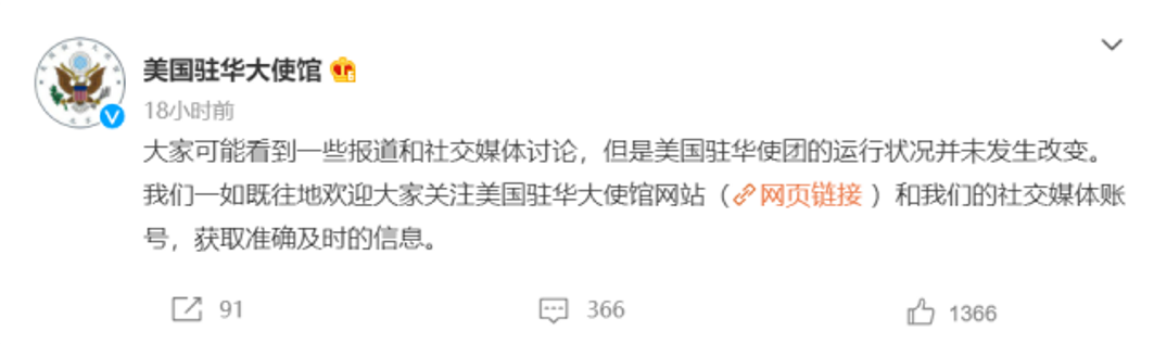 美国驻华大使馆在1月26日晚间在微博发声,确认了“美国驻华使团的运行状况并未发生改变。”