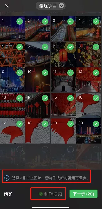 本次更新后,发朋友圈时可以选择 9 张以上图片,但是微信会要求将图片转制成小视频: