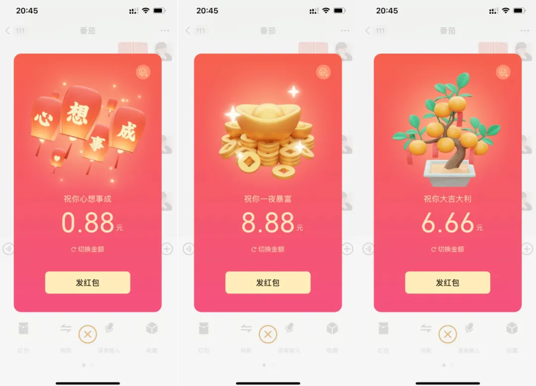 拜年红包不能自定义金额,系统会随机选择一些吉利数字。比如:2.88、1.66、6.66、8.88、0.88、2.33等。每个数字配套带有不同的祝福语和不同的动态效果。