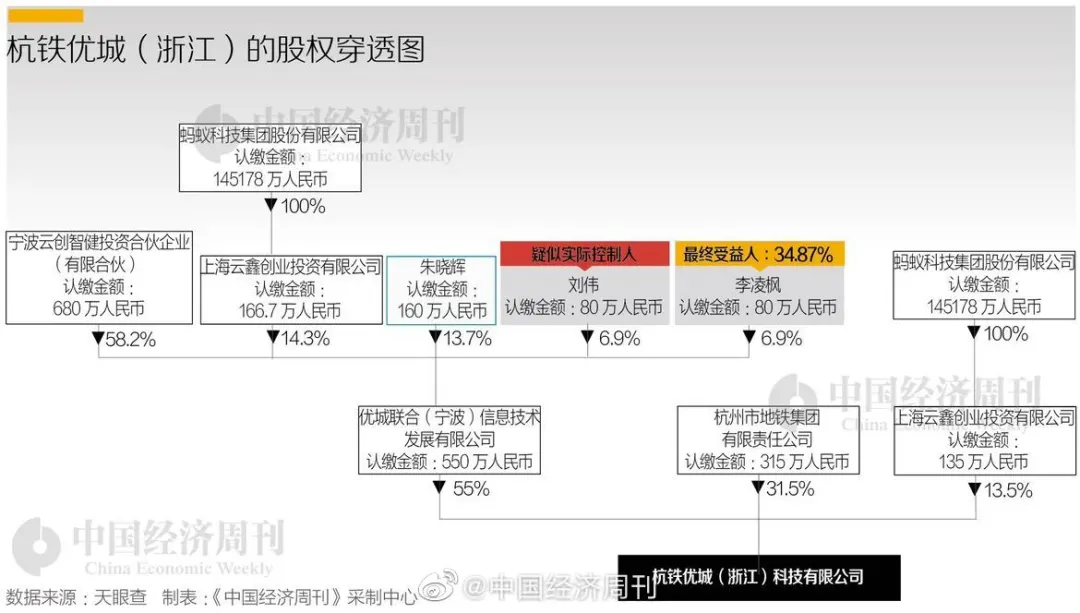 而据《中国经济周刊》上文的报道,天眼查APP显示的杭铁优城科技有限公司股权结构中,优城联合占股55%,杭州地铁集团占股31.5%,而蚂蚁科技集团全资控股的上海云鑫创业投资有限公司又投了135万元,占股13.5%。