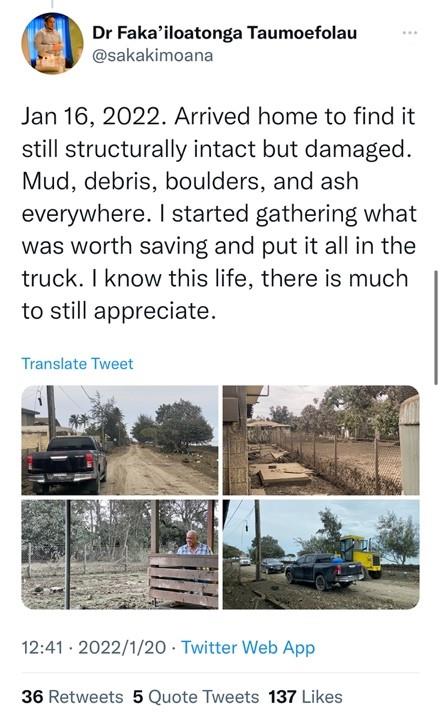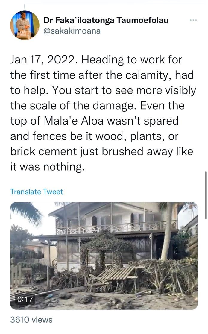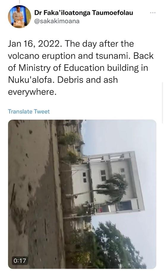 1月16日,陶莫弗劳上传了首都努库阿洛法建筑受损的视频,他写道:“到处都是碎片和火山灰”。