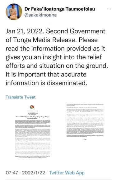 1月21日,陶莫弗劳在“日记”中发布了汤加政府在灾后的第二份声明。他写道:这可以让你更深入地了解当地救援工作的情况。