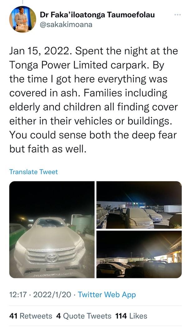 直到1月20日,他才开始补写15日晚上的场景:他在汤加电力公司的停车场度过了灾后的第一个夜晚。