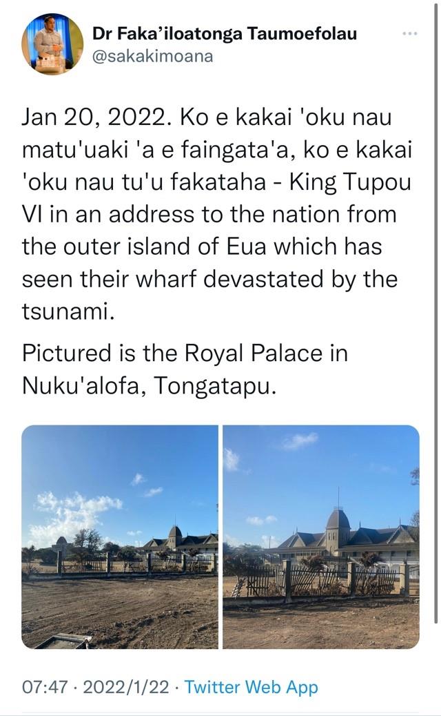在1月20日的“日记”里,陶莫弗劳记录了多国对汤加的援助,以及汤加国王鼓舞民众共同面对逆境的讲话,并附上被火山灰覆盖的汤加皇宫图片。