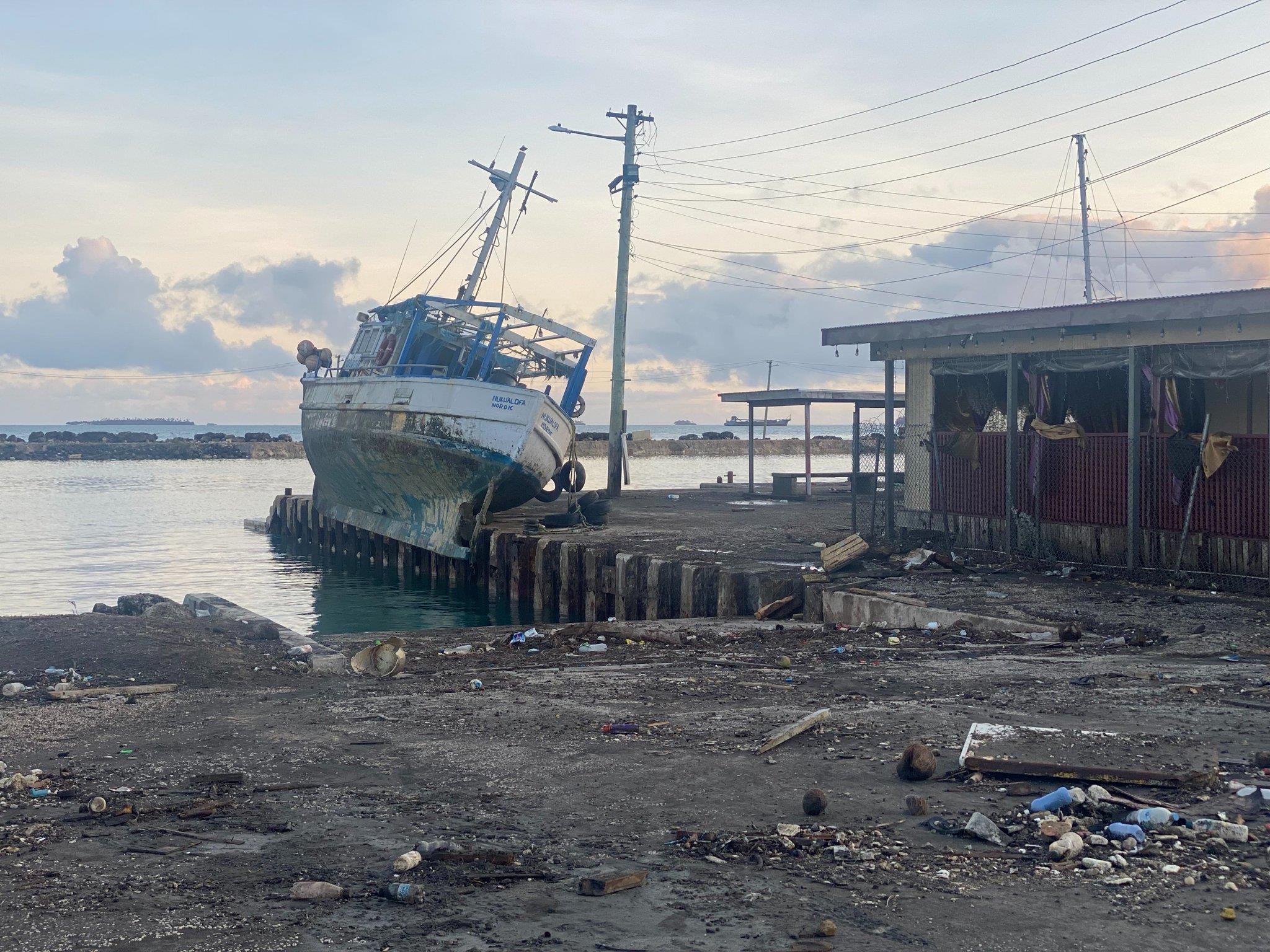 1月18日,陶莫弗劳发布了两张当地码头灾后受损的图片:一只轮船被海啸卷上岸边,歪倒在电线杆旁;码头上停靠着小型船只,旁边的道路仍然被火山灰覆盖,但远处的夕阳隐隐透出橙色。