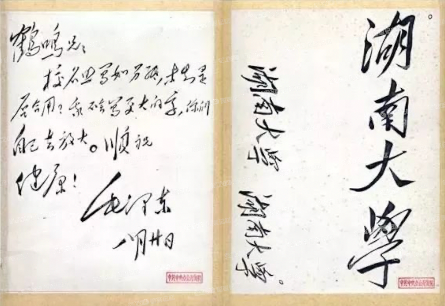 1950年8月20日,毛泽东主席应李达的请求,题写了三个校名供湖大选择,同时他在回函中写道:“鹤鸣兄:校名照写如另纸,未知是否合用?我不会写更大的字,你们自己去放大。顺祝健康!毛泽东八月廿日”