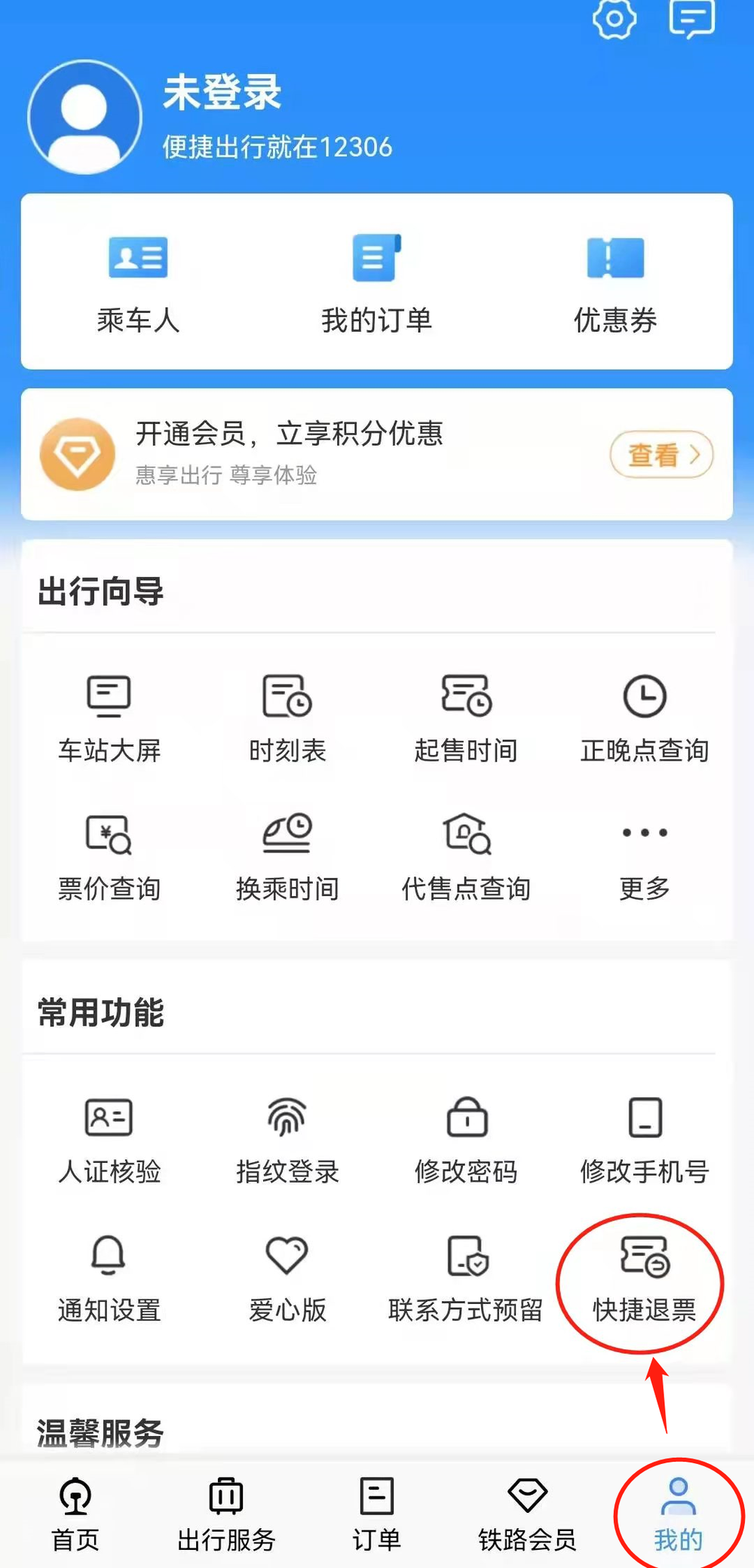 1、打开铁路12306App,点击右下角“我的”,在“常用功能”栏选择“快捷退票”功能