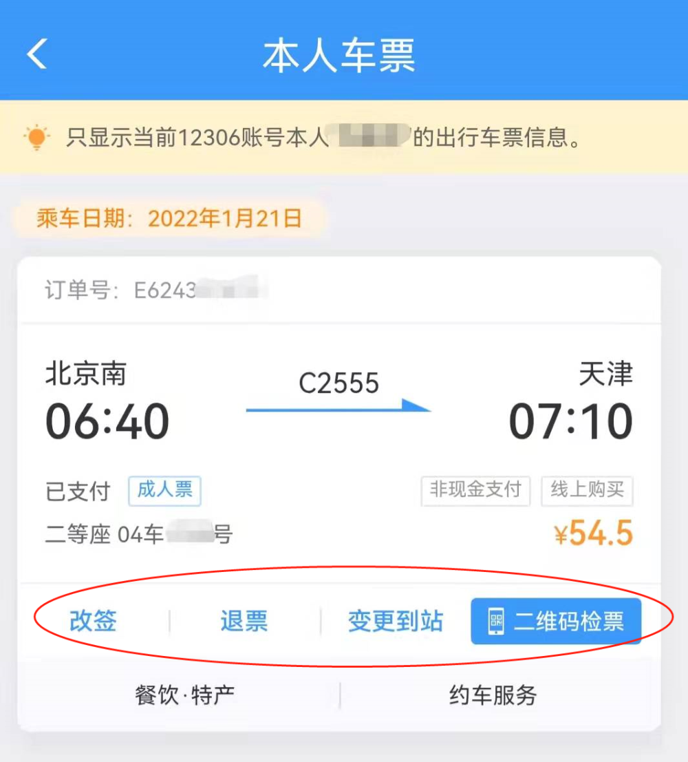 在这个页面,可以查看本人名下的所有车票,包括本人购买的和他人代为购买的车票。
