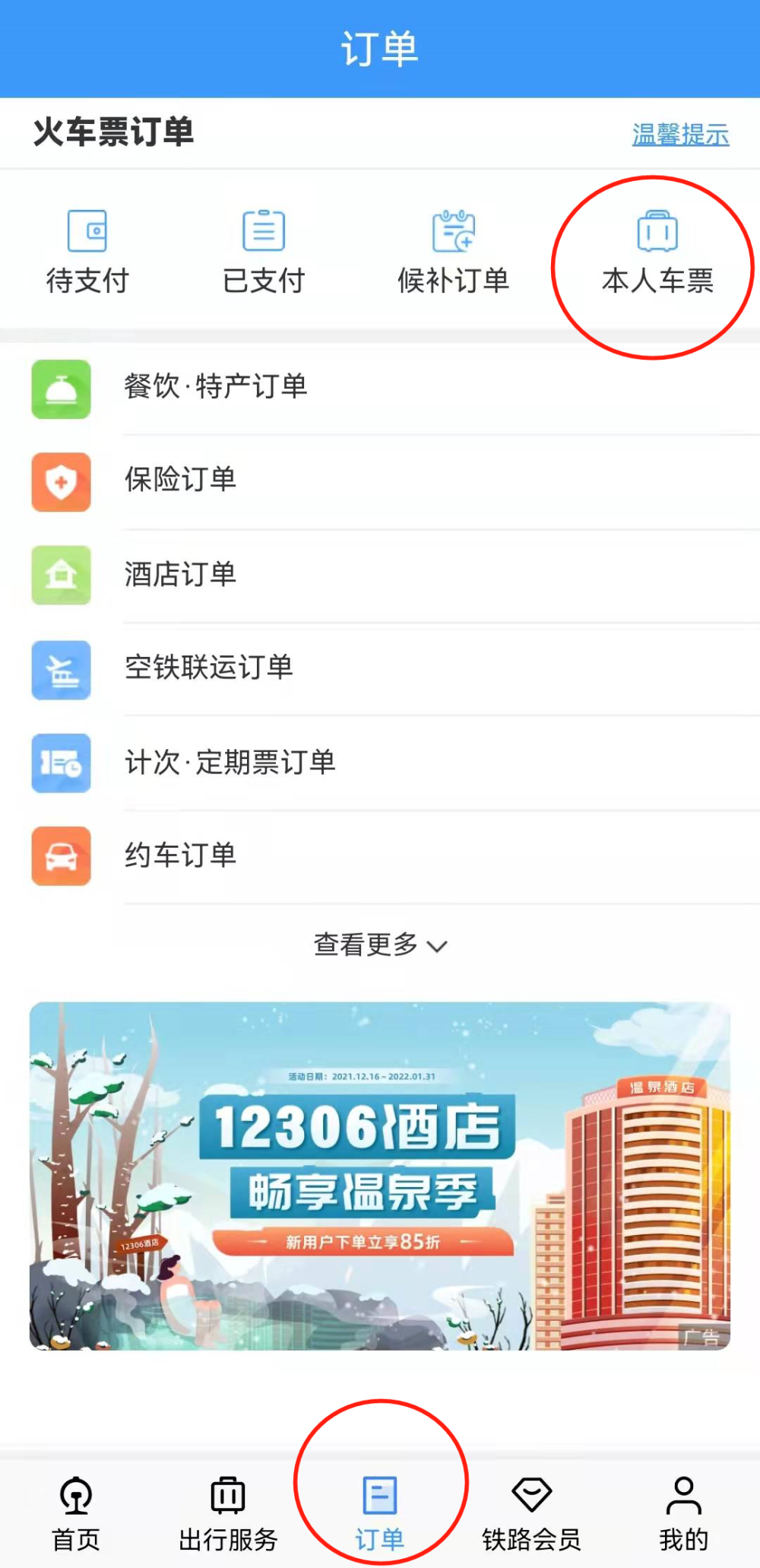 1、点击首页“订单”,选择右上角“本人车票”
