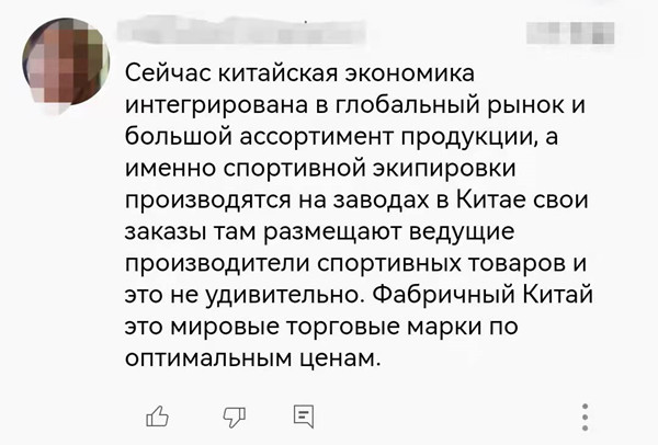“如今中国在经济上已经融入了国际市场,而且能够提供各门类的商品,尤其是运动装备。有很多领先的运动产品生产商在中国的工厂有大量订单,这也已经不足为奇了。中国制造不仅全球知名,价格也很友好。”