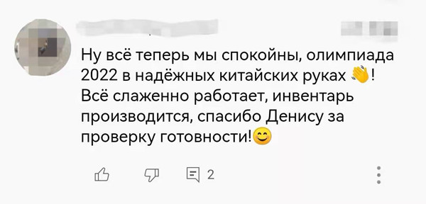 “看到这一切我们就放心了,中国一定能办好这届冬奥会。一切都进展顺利,设备也能自给自足。感谢博主的分享!”