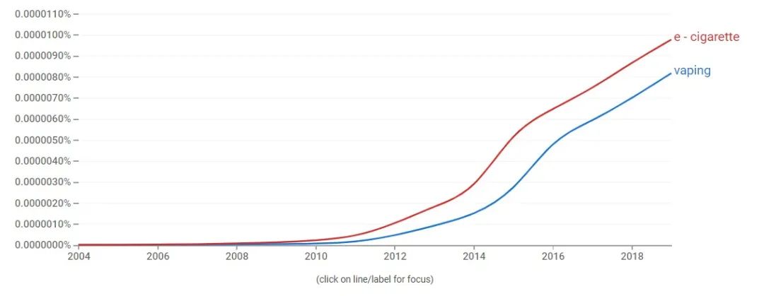 在搜索引擎中检索电子烟的两个英文名“vaping”和“e-cigarette”,可以看到自2010年开始,电子烟的网络热度便直线上升,到现在也没有冷却的迹象。