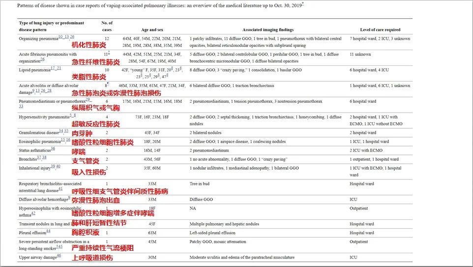 上节中提到的加拿大小伙并非个案。CMAJ文章的作者梳理了截至2019年10月底作为“case reports”报道的与电子烟相关的严重肺部疾病,涉及18个病种。能作为case reports一般意味着病情较重,最轻的都是住院,重的直接进ICU。而另外一些更大规模的队列研究中,电子烟相关的肺病多达上千例(MMWR Morb Mortal Wkly Rep. 2019, 68, 860–864.)。
