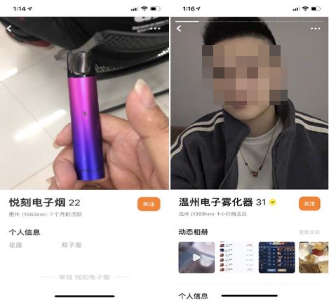 同时,记者在探探、虎扑、豆瓣等多个社交平台上都找到了电子烟销售的相关信息,均在个人主页上明确暗示有电子烟销售。