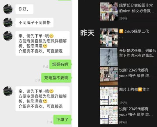↑客服称“加微信交流”,朋友圈均为电子烟销售信息