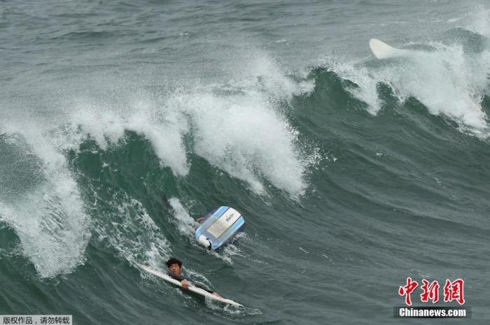 当地时间1月15日,在汤加发生海底火山喷发后,美国国家气象局发布了针对美国整个西海岸的海啸警报。图为美国国家气象局发布海啸警报后,冲浪者在加州海边冲浪。