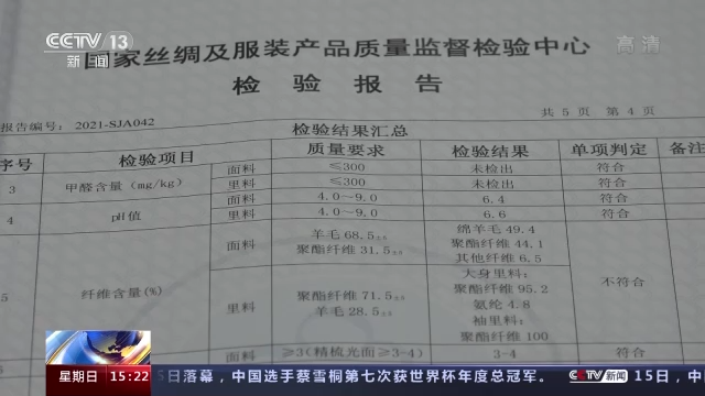 国家丝绸及服装产品质检中心 高级工程师 魏红:经过检测发现,这22批次不合格产品中,其中有2项,pH值、绳带(要求),都是国家强制性安全性指标不合格,其中,使用说明、标识标签、皂洗色牢度、纤维含量、起球、外底拉伸性能,这6项产品技术指标也不合格。