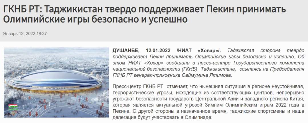 报道称,塔吉克斯坦国家安全委员会将积极采取措施,消除潜在的威胁,保障塔吉克斯坦运动员乃至全体代表团的安全和冬奥会的成功。