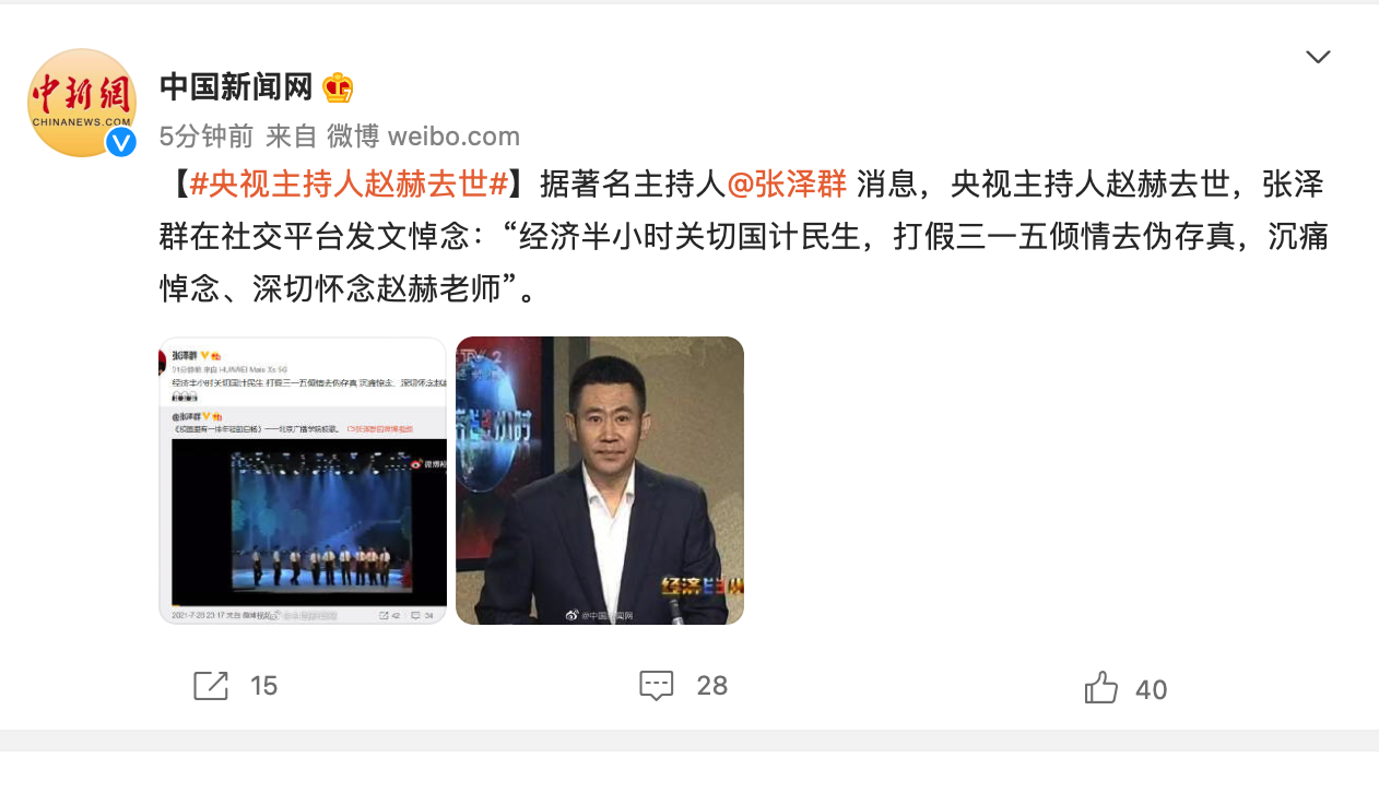 据著名主持人张泽群消息,央视主持人赵赫去世,张泽群在社交平台发文悼念:“经济半小时关切国计民生,打假三一五倾情去伪存真,沉痛悼念、深切怀念赵赫老师”。