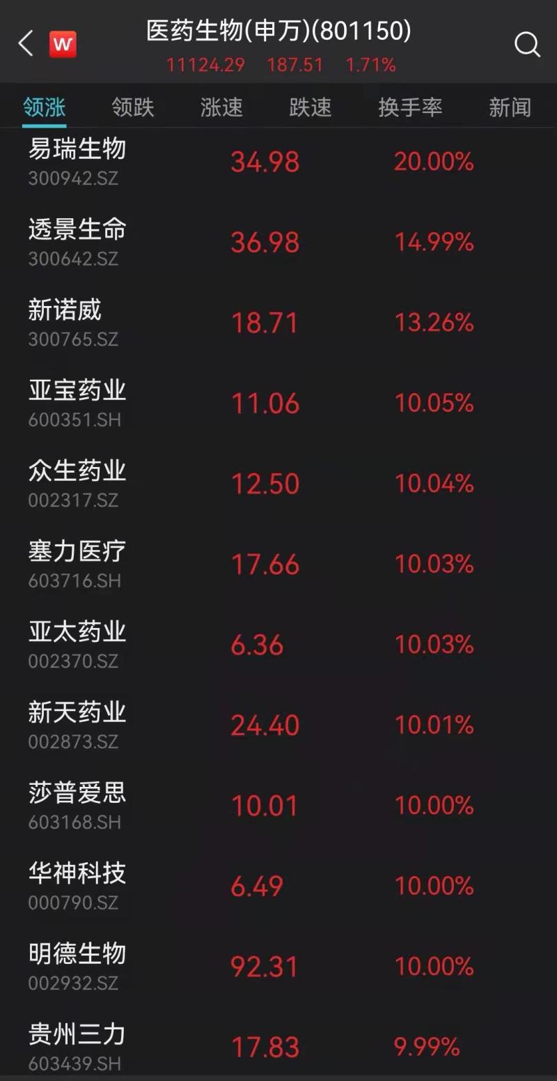 今日上午,医药生物板块涨幅居前,易瑞生物、众生药业、亚太药业、新天药业、莎普爱思等涨停,透景生命、新诺威等涨幅超过10%。