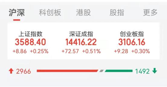 今日早盘各大指数探底回升,小幅反弹,近3000只个股上涨,医药生物板块掀起涨停潮。截至午间收盘,上证指数上涨0.25%,深证成指上涨0.51%,创业板指上涨0.3%。
