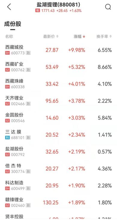 受西藏盐湖或纳入重点建设项目消息影响,盐湖提锂异动拉升,西藏城投盘中涨停,西藏矿业、西藏珠峰、盐湖股份、赣锋锂业等涨幅居前。