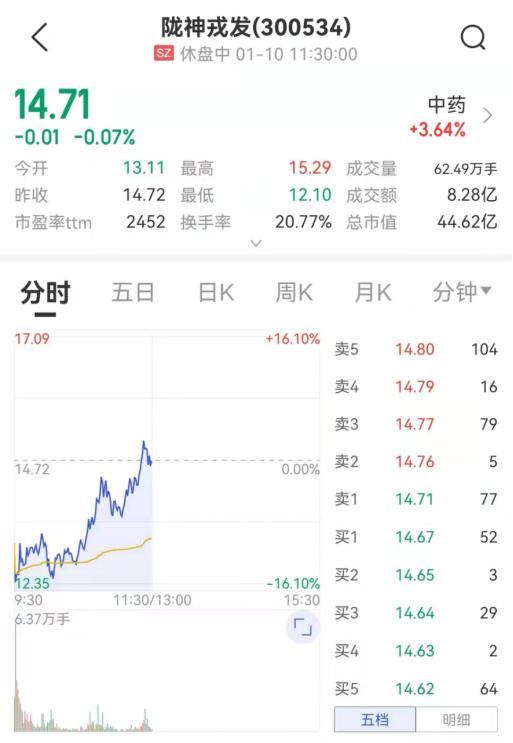 前期大幅上涨的陇神戎发今日复牌,开盘一度跌超15%,随后大幅拉升,截至午盘仅微跌0.07%,报14.71元/股。