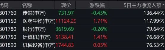 从北向资金的流向来看,5日主力净流入额居于首位的是传媒行业,为136亿元;其次是医药生物行业,为118亿元;银行板块的5日主力净流入额居于行业第三位,为79亿元。