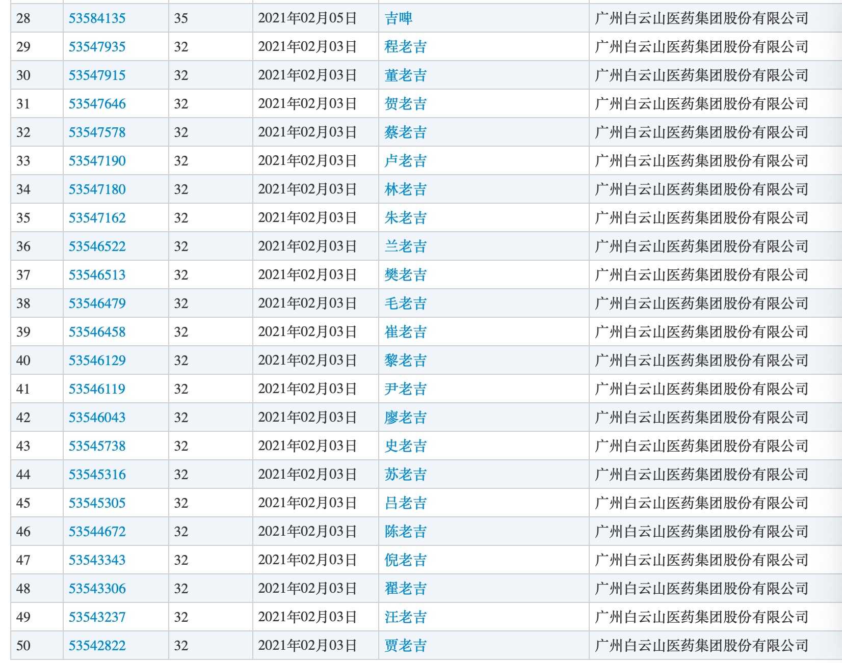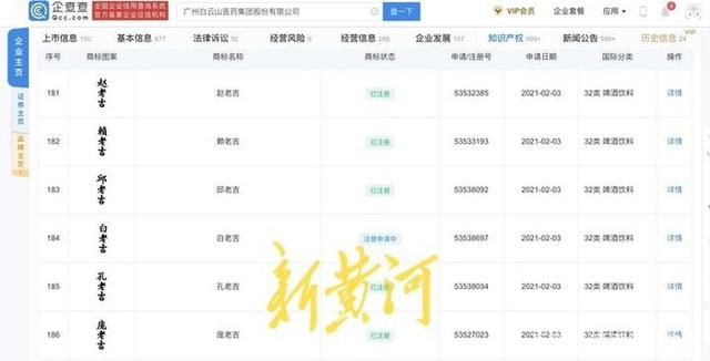 澎湃新闻记者在上述工商信息查询App检索“广州白云山医药集团股份有限公司”发现,其商标信息多达2366个。其中,知识产权商标信息一栏显示,广州白云山医药集团于2021年2月3日对包括“彭老吉”、“杨老吉”、“姜老吉”在内的百余个姓氏商标申请注册,其国际分类为“32类啤酒饮料”。