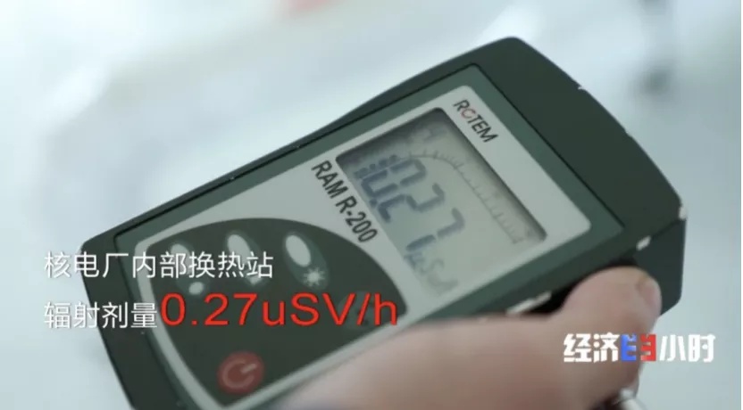 那么,核电供暖究竟有多大辐射?到底安不安全?核电厂内部的换热站,是蒸汽进行第一次换热的地方,通过仪器可以看到此时的辐射剂量为0.27微希伏每小时。
