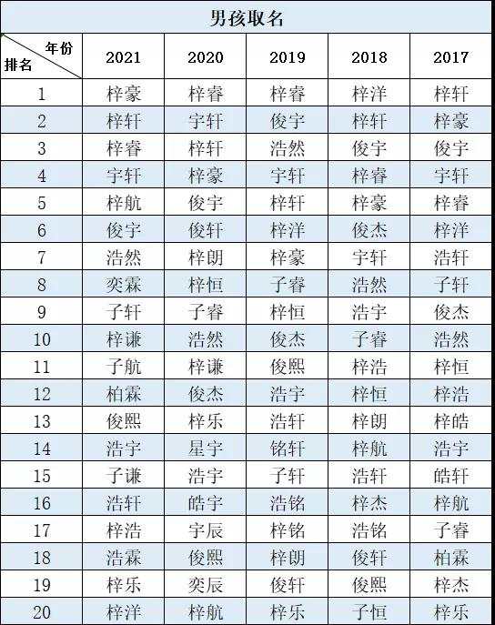 近日佛山市公安局公布佛山地区2021年新生儿取名热门。男孩取名为“梓豪”的最多,排名第2至10的男孩名字为梓轩、梓睿、宇轩、梓航、俊宇、浩然、奕霖、子轩、梓谦。男孩取名单字的前5名为睿、昊、皓、越、辰。女孩取名为“芷晴”的最多,排名第2至10的女孩名字为梓晴、语桐、芊妤、芯妍、芷瑶、雨桐、可晴、乐瑶、梓潼。女孩取名单字的前5名为可、玥、悦、滢、果。