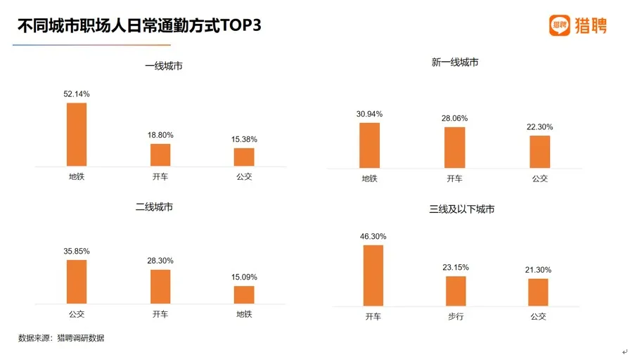 从不同城市职场人TOP3的上下班通勤方式来看,一线城市占比最高的是地铁,为52.14%;开车以18.8%的占比位居第二;公交以15.38%的占比位居第三。新一线城市占比前三的通勤方式亦为地铁、开车、公交,占比分别为30.94%、28.06%、22.3%。二线城市排名第一的上下班通勤方式为公交,占比35.85%;其次是开车占比28.3%;地铁以15.09%的占比位居第三。三线及以下城市通勤方式排名第一的是开车,占比46.30%;其次是步行,占比23.15%;公交以21.30%的占比位居第三。