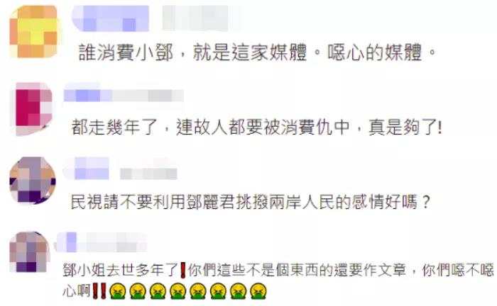 不少人认为其实是绿媒在消费邓丽君,“都走了多年了,连故人都要被消费‘仇中’,真是够了!”也有人请绿媒不要利用邓丽君挑拨两岸人民的感情。