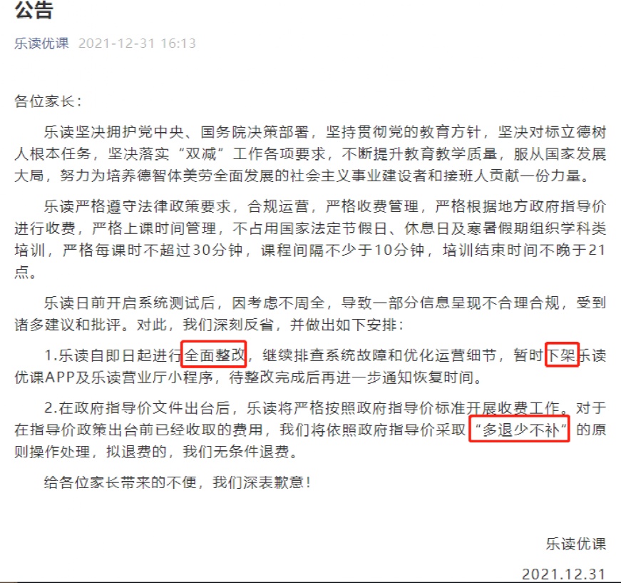 2021年12月31日下午,乐读优课在官方微信发布公告称:自即日起进行全面整改,暂时下架乐读优课APP及乐读营业厅小程序,对于在指导价政策出台前已经收取的费用,将依照“多退少不补”的原则操作处理,拟退费的,无条件退费。