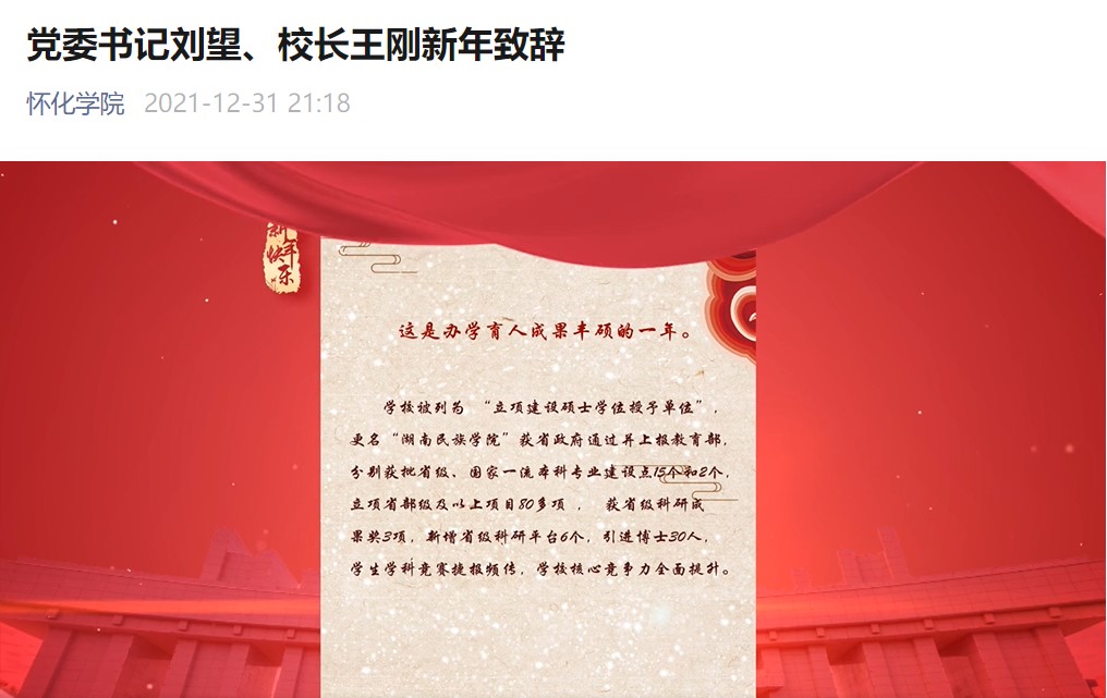 “怀化学院”官方微信公众号2021年12月31日发布了《党委书记刘望、校长王刚新年致辞》。其中提到:(过去一年)学校被列为“立项建设硕士学位授予单位”,更名“湖南民族学院”获(湖南)省政府通过并上报教育部。