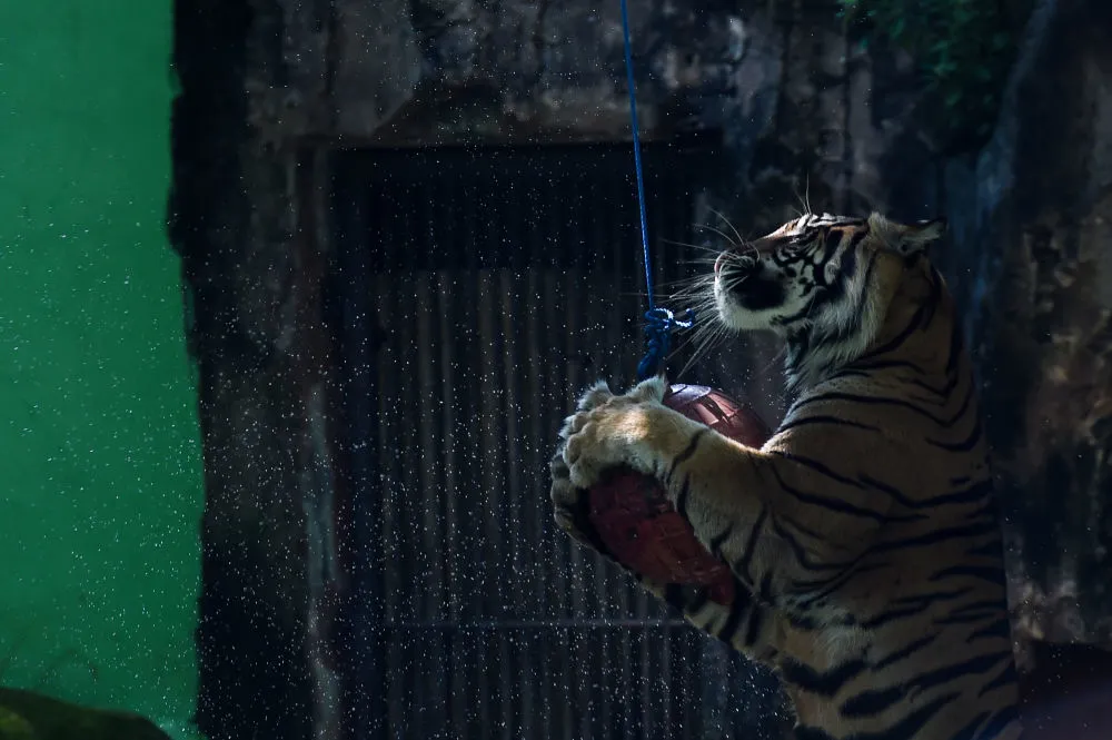 2020年5月17日,一只苏门答腊虎在印度尼西亚雅加达的拉古南动物园内玩球。新华社发,阿贡摄