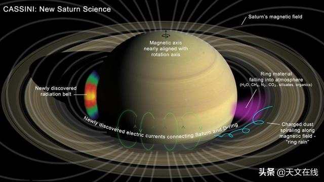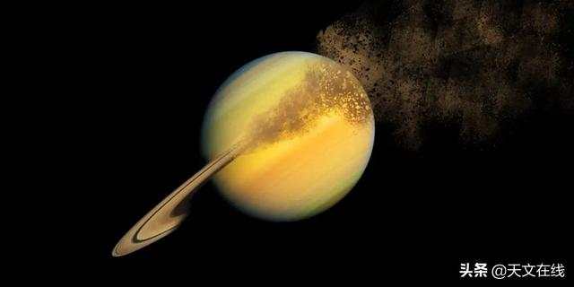 之后这会导致土星强大的磁场影响这些粒子并将这些粒子折向土星本身。土星的重力拉动这种沿其磁场线运转的带电物质,最终导致粒子在进入土星的高层大气时燃烧。在这个过程中,卡西尼号还探测到更多的环状物质落入气态行星赤道。经科学家们计算,每秒大约有22000 磅(约10吨)的环雨正在被分解,每半小时就能填满一个奥林匹克规格的游泳池。