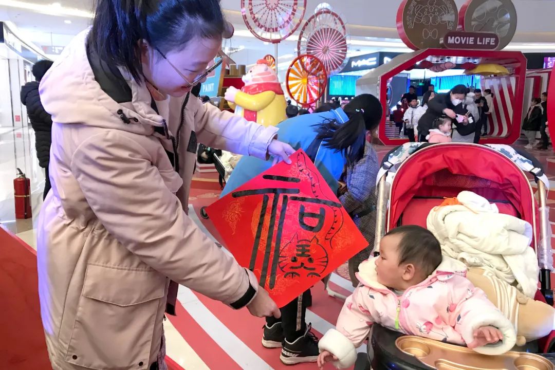 书法家全朝晖在篆书传统“福”字上即兴创作栩栩如生的“萌虎”,吸引不少群众。“家里贴上书法家手写的春联,我们家今年一定能‘虎虎生威’‘如虎添翼’。”来自金茂梅溪湖小区的李先生感慨地说,往年都是买的印刷春联,没想到书法家把春联送到了家门口。在百福墙打卡区,人头攒动,手机闪烁一片,人人脸上乐开了花。