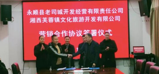 湖南日报·新湖南客户端1月9日讯(记者 廖慧文 通讯员 严萍)1月7日,湖南华夏投资集团有限公司与永顺土司文化旅游发展集团有限公司合资成立的湘西芙蓉镇文化旅游开发有限公司分别与永顺县老司城开发经营有限公司、湘西不二门国家森林公园有限公司、湘西猛洞河旅游开发有限公司签署宣传推广、营销合作一体化协议,将以芙蓉镇为圆心,与周边30公里内的红石林、老司城、不二门、猛洞河等名胜景点共筑“芙蓉镇双世品牌旅游度假区”,打造多元集群旅游目的地和湘西北旅游集散地。