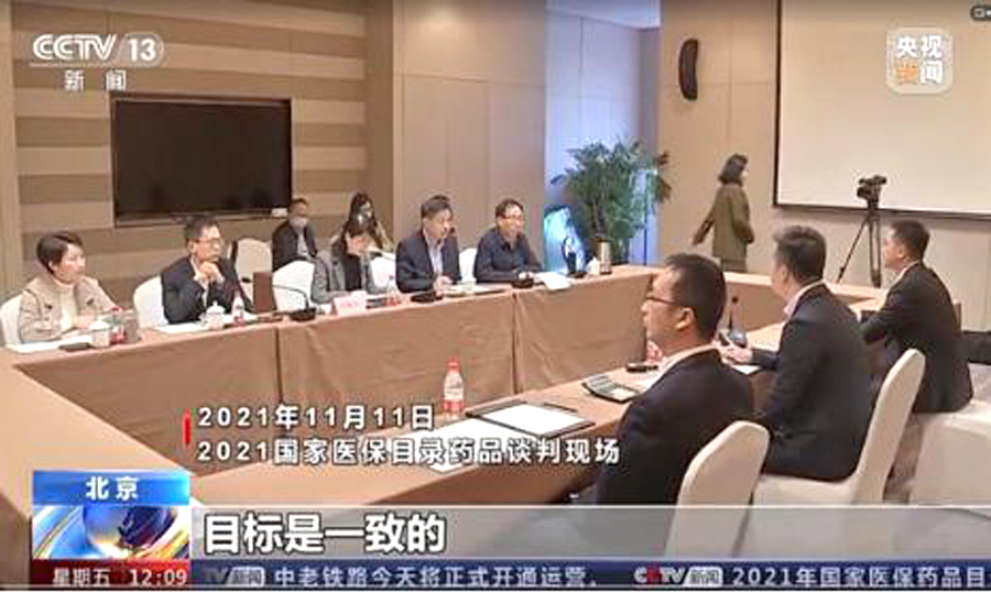 2021年11月11日,国家医保目录药品谈判现场。治疗罕见病脊髓性肌萎缩症的进口药——诺西那生钠注射液经八轮谈判,由原来70万元一针的“天价”降至3.3万元,给许多家庭带来了希望。(图据央视新闻)
