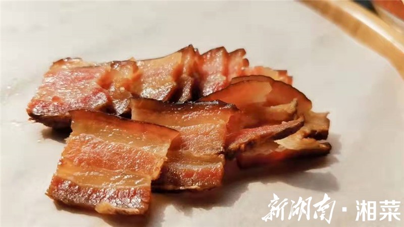 在北辰国际会议中心九州厅的C区,湖南智辰展位前高高悬挂的纸包腊肉十分吸睛,与以往常见的腊肉不同,纸包腊肉外面裹着一层食品熏制专用纸,撕掉外包装,色泽红润,十分诱人。将腊肉切成薄片摆盘,撒上辣椒粉和豆豉蒸制出锅,香味扑鼻,刚端出来就被前来观展的顾客试吃一空。除了亮相首届湘菜产业链博览会,在“味道湖南·县长掌勺”活动中,安化县副县长的掌勺菜品所选取的食材正是湖湘肴的纸包腊肉。