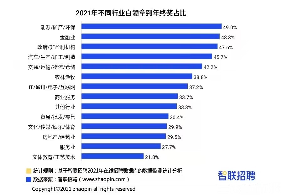 从行业来看,能源、金融等传统行业白领领取年终奖情况更好,文体教育排名垫底。其中,能源、矿产、环保行业白领获得年终奖的占比最高,达到49%,也就是说该行业近一半的白领从业人员均能如期拿到年终奖。“传统行业在经济复苏回暖过程中,保持了经济发展的中坚地位,更能创造出红利与职场人分享。”招聘专家表示,得益于国内疫情的有效防控,居民生活在2021年逐步恢复正常,服务业白领拿到年终奖的占比从2020年的17.7%上升至27.7%。