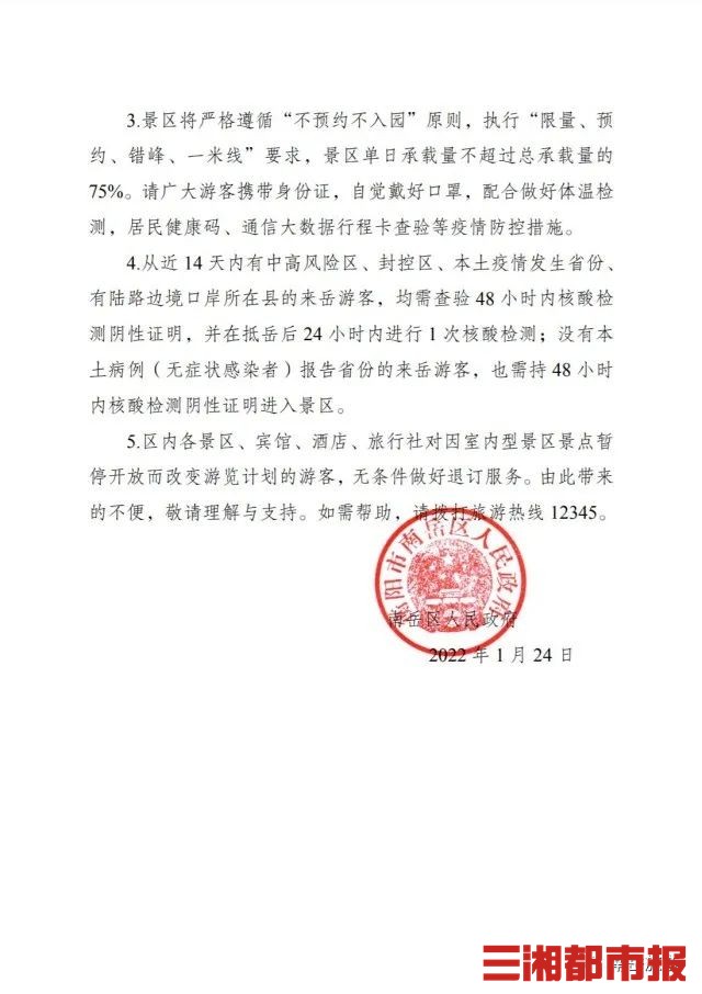 南岳衡山景区提醒游客:请从全域旅游服务中心、康家垅门票站、西岭门票站、白龙潭门票站进入中心景区;莲塘、龙凤、大禾田、会仙桥门票站点暂时关闭。景区严格遵循“不预约不入园”原则,执行“限量、预约、错峰、一米线”要求,单日承载量不超过总承载量的75%,游客需携带好身份证,自觉戴好口罩,配合做好体温检测,出示居民健康码、通信大数据行程卡等,做到有序入园。同时,游客需遵守景区森林防火规定,严禁携带一切火源进入景区景点。如需帮助,游客可拨打旅游服务热线12345。
