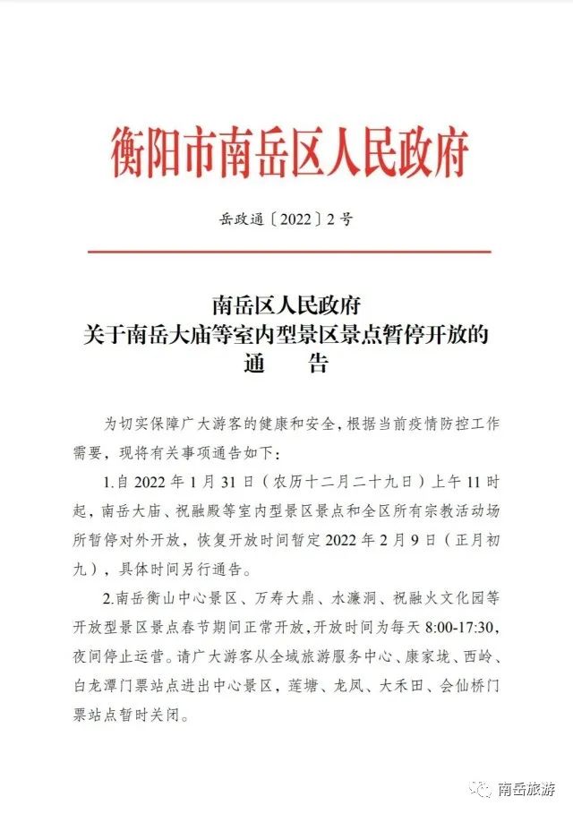 三湘都市报·新湖南客户端1月25日讯(全媒体记者 丁鹏志)今日,记者从衡阳市南岳区了解到,自2022年1月31日(农历十二月二十九日)上午11时起,南岳大庙、祝融殿等室内型景区景点及全区所有宗教活动场所暂停对外开放,恢复开放时间暂定2月9日(正月初九),具体时间另行通知;南岳衡山中心景区、水濂洞、万寿大鼎、祝融火文化园等室外型景区景点春节期间正常开放,每天开放时间为8:00-17:30。