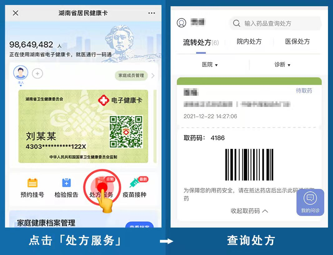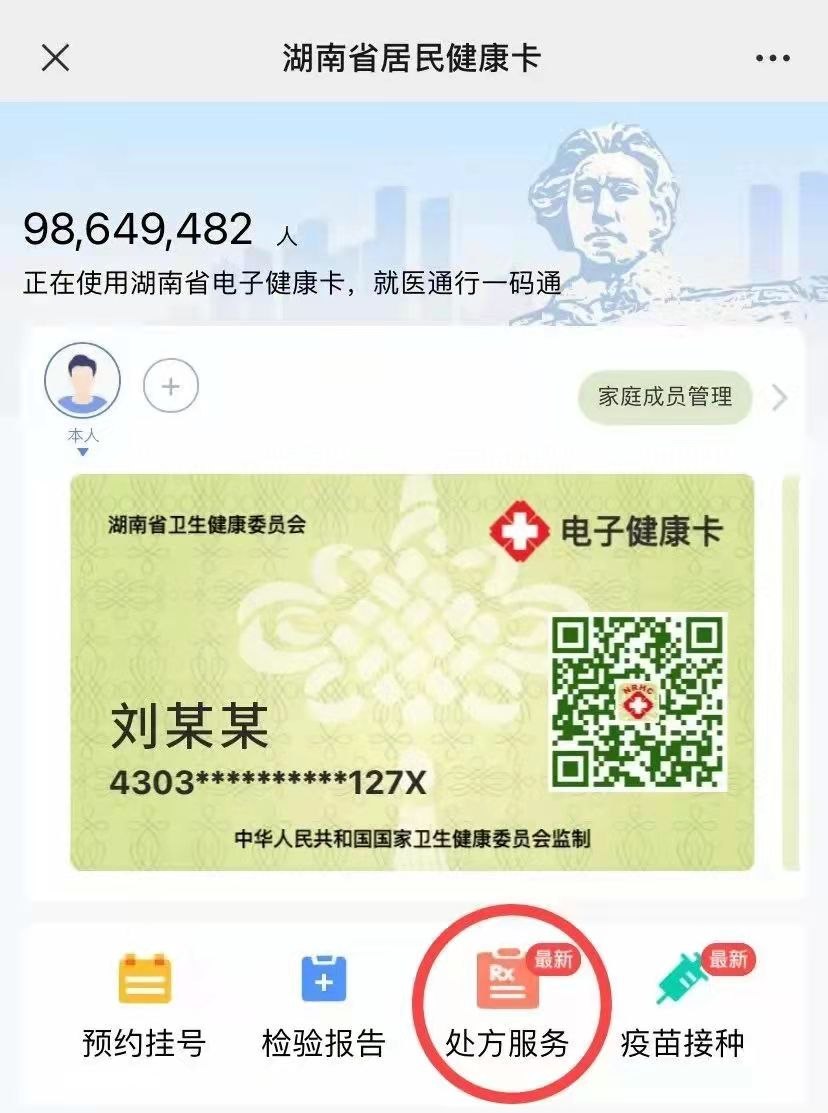 微信打开“湖南省居民健康卡”,点击进入「处方服务」模块,可体验处方查询、凭方复诊、凭方购药、送药上门、用药指导等医疗、医药服务。