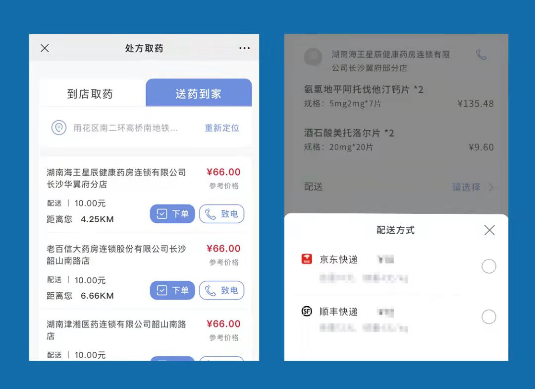 平台可为不方便到店的患者提供送药到家服务,线上复诊后在家即可购药,患者可自主选择顺丰或京东送药上门,全流程可监管、可追溯,安全合规,方便快捷。